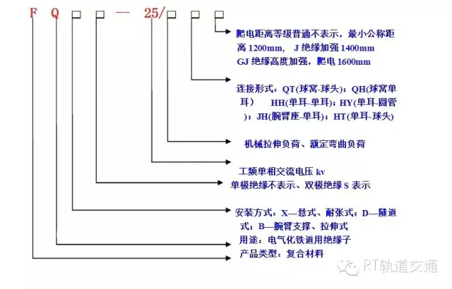 實例—FPQ-10T20針式復合絕緣子:F-復合絕緣子;P-針式絕緣子;T—鐵擔安裝;Q-接觸網用;10-額定電壓kv;20-機械負荷KN