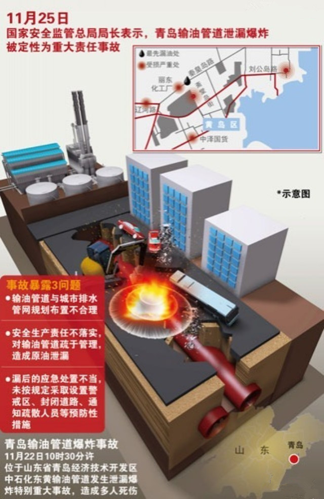 2013年11月22日10時25分,位于山東青島經濟技術開發區的中國石油化工股份有限公司管道儲運分公司東黃輸油管道原油泄漏發生爆炸,造成62人死亡、136人受傷,直接經濟損失7.5億余元。
