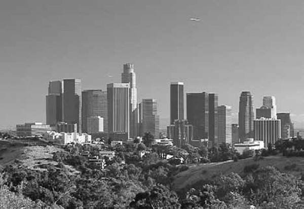 (上)洛杉磯晴天,(下)被光化學(xué)煙霧掩蓋。空氣停滯在城市上空時(shí),汽車與工業(yè)廢氣越積越多,減弱下午的陽(yáng)光,變成陰暗的霾,使臭氧水平劇增。