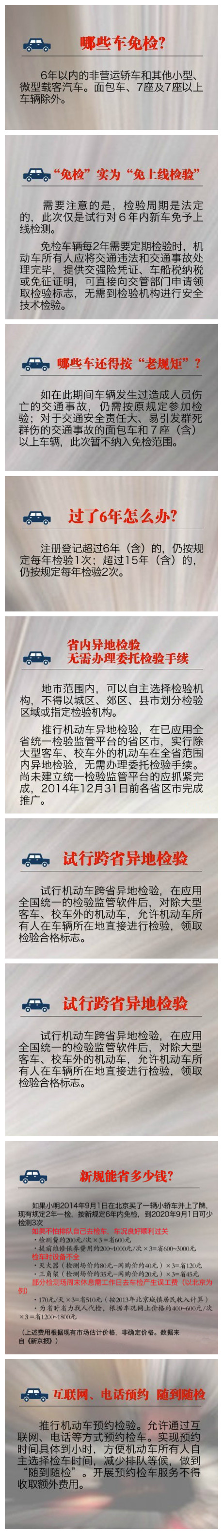 從2014年9月1日起,實行6年免檢新規了,驗車規則技巧全收藏!6年以內的非運營轎車和其他小型、微型載客汽車免檢政策到底什么意思?哪些車可以免檢?哪些車還得按老規矩?如何便捷驗車?車主和準車主們,速速學習!