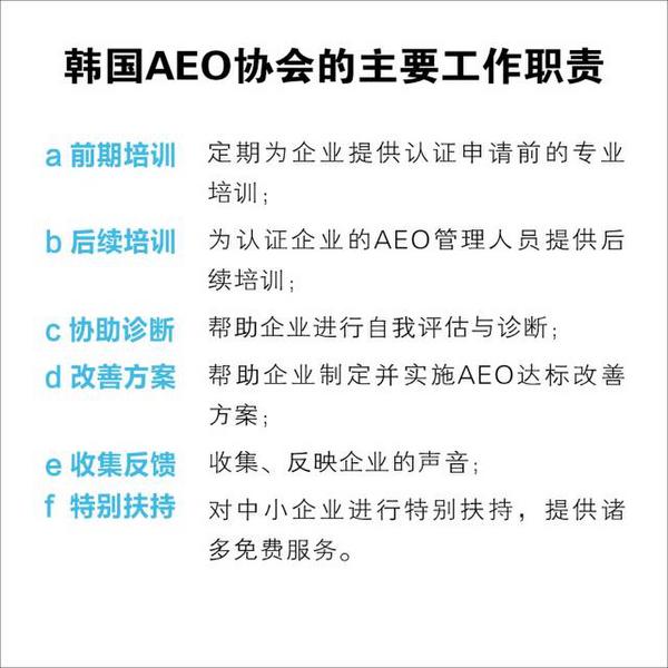 此外,對于韓國AEO制度而言,兩個組織分別發揮了至關重要的作用。一是韓國AEO認證委員會,其主要職能為審核、決定企業認證申請,以及已經獲得AEO認證企業的認證維持、取消等事項;二是韓國AEO協會,它是由獲得AEO認證資格的企業組成的非政府組織,宗旨是為企業爭取AEO認證提供指導和幫助。