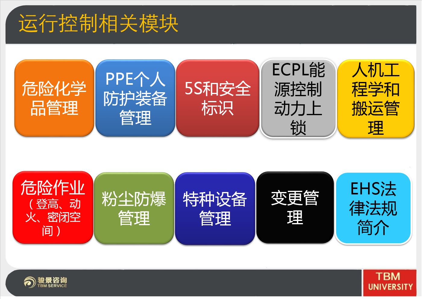 在Do-實施部分,安全領導力的課程共涉及危險化學品管理、ECPL能源控制動力上鎖(LOTO),人機工程學等10個模塊,如下圖: