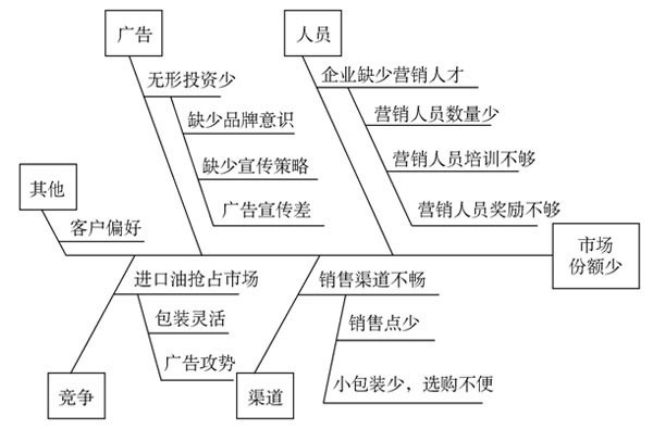 圖中的“魚頭”表示需要解決的問題,即該煉油廠產(chǎn)品在市場(chǎng)中所占份額少。根據(jù)現(xiàn)場(chǎng)調(diào)查,可以把產(chǎn)生該煉油廠市場(chǎng)營(yíng)銷問題的原因,概括為5類。即人員、渠道、廣告、競(jìng)爭(zhēng)和其它。在每一類中包括若干造成這些原因的可能因素,如營(yíng)銷人員數(shù)量少、銷售點(diǎn)少、缺少宣傳策略、進(jìn)口油廣告攻勢(shì)等。