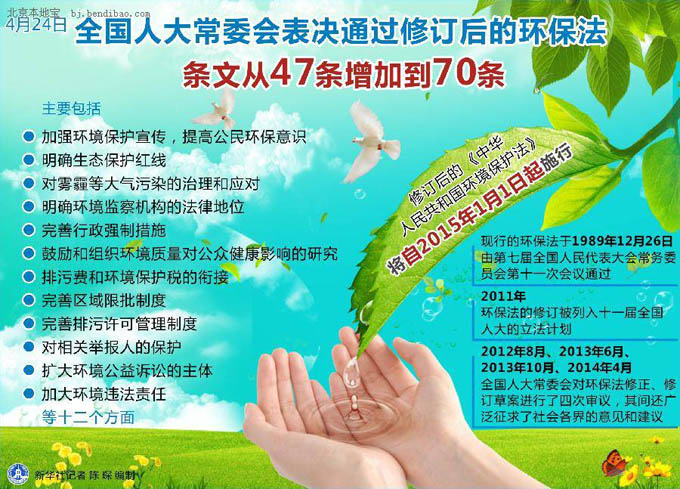 圖表:全國人大常委會表決通過修訂后的環(huán)保法 條文從47條增加到70條 新華社記者 陳琛 編制
