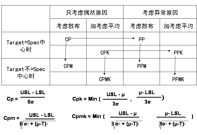 而CPM\CPMK\PPM\PPMK即所謂的第二代能力指數對應的公式和上述對應公式也相同,所不同的還是下面變差部分的不同。