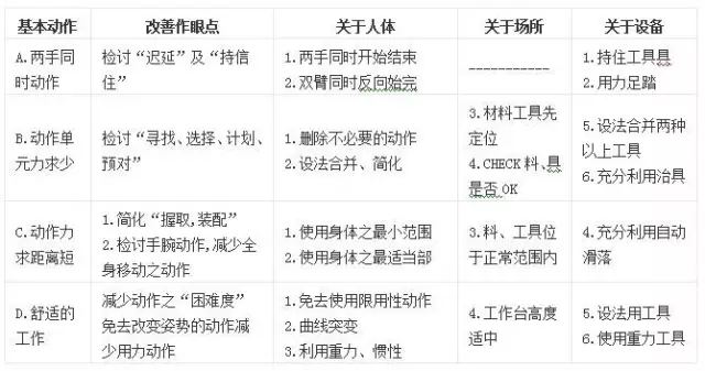 前面各節(jié)中,吾人已群探討過(guò)動(dòng)作改善的原則,為方便動(dòng)作分析及改善起見(jiàn),吾人可將之再歸納成下列的4個(gè)基本方向。