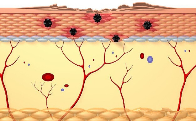 (1) 機械作用:反復或持續的摩擦和壓迫可引起局部皮膚的角化過度,發生駢服,并可引起指甲的損傷,搔搓、袖口或靴筒的摩擦,可促進接觸性皮炎的發生和發展。皮 膚的擦傷可以導致鉻、鉸等物所致的皮膚潰瘍或引起化膿性皮膚病的發生。石棉或玻璃纖維刺入皮膚時,作為異物的刺激可使周圍組織增生而形成沈狀物。粉塵可以阻塞毛囊口,影響皮膚的正常功能,增加感染機會,或發生毛囊性皮疹,痤瘡,皮膚搔癢等。爆破時的粉塵可以嵌入皮膚,形成爆粉沉著癥。