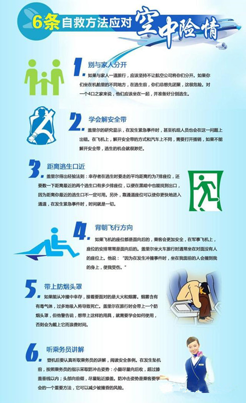 飛機失事前會有一些預兆,如機身顛簸,飛機急劇下降,機身破裂艙內突然減壓,艙外出現黑煙,艙內出現煙霧或塵土飛揚等。大家要學習一些乘坐飛機的安全常識,危急時刻能夠冷靜自救: