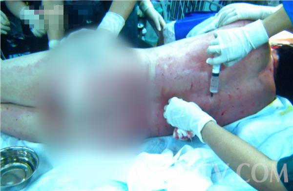 鎮(zhèn)江一位46歲的清潔工孫先生,在彎腰打掃衛(wèi)生的時候,一桶氫氟酸從柜子上灑下,導(dǎo)致全身30%面積沾上了這種致命物質(zhì),出現(xiàn)了腎臟、心臟和肺等多個器官的衰竭。 醫(yī)生表示,雖然氫氟酸的酸性沒有硫酸高,但它滲透性強,既能破壞皮膚,又能損傷內(nèi)臟。從現(xiàn)有病例來看,人體只要超過3%的面積沾上了這種氫氟酸,基本就無法救活。而為了搶救孫先生,醫(yī)院一面緊急輸血,一面向皮下、血管里補充鈣質(zhì),目前通過血液透析、抗休克等綜合搶救,孫先生的病情暫時穩(wěn)定,不過仍未脫離生命危險
