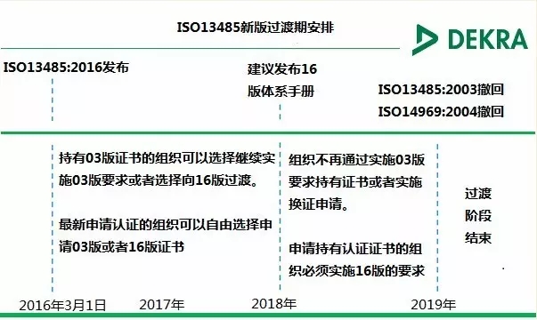 目前根據討論的要求, 2003版的ISO13485將在新標準發布后3年失效,建議在2016版2年內完成過渡期,2018年以后企業不再運行2003版的要求。具體的過渡安排見下表: