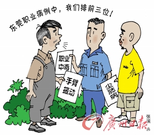 分析報告指出,東莞許多企業規模小、資金少,存在許多職業病危害因素。2003~2012年東莞報告新發職業病病例涉及8大類職業病共895例,其中發病居前3位的為職業中毒371例(占41.5%)、物理因素所致職業病178例(占19.9%,以手臂振動病為主)、塵肺病105例(占11.7%)。